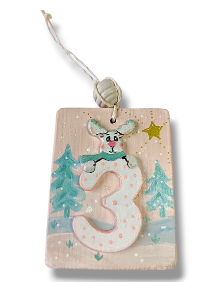 Cette délicate décoration en bois met en scène un petit renne pastel, doux et attendrissant, accroché à un grand chiffre 3 en relief décoré de pois roses.