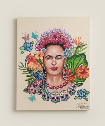 Cette œuvre originale, peinte à l'huile par ma maman, est un vibrant hommage à l'icône Frida Kahlo, capturant son esprit indomptable et son univers foisonnant. Le portrait est sublimé par une profusion de fleurs éclatantes, de motifs évoquant le folklore mexicain avec ses calaveras stylisées, et la présence majestueuse d'un perroquet coloré, symboles de vie, de nature et de culture. Le regard intense de Frida traverse la toile, porteur d'une force et d'une poésie singulières.