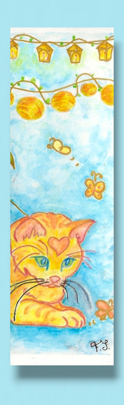Peint à l’aquarelle puis délicatement travaillé aux crayons de couleur, ce félin lumineux accompagnera vos lectures d’une touche de magie et de douceur.