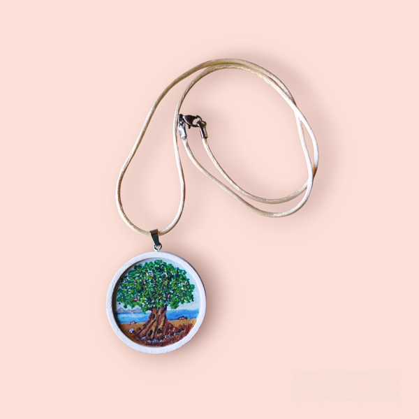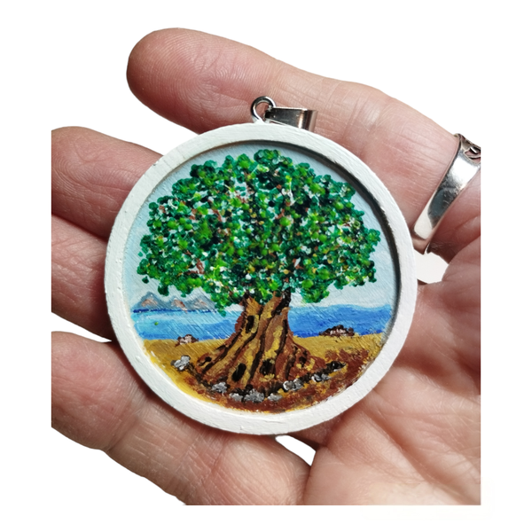 "Ce médaillon Ancien Olivier est un hommage à la sagesse ancestrale et à la force tranquille de la nature, peinte avec délicatesse sur la noblesse du bois. Chaque détail de cet arbre millénaire évoque la persévérance et l'enracinement, offrant un symbole de paix et de résilience à porter au quotidien, un fragment d'histoire et de sérénité."