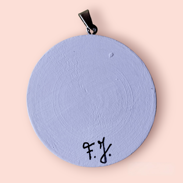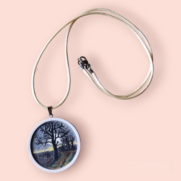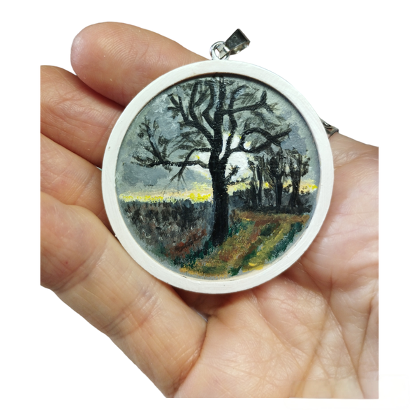 "Ce médaillon, peint avec délicatesse sur la noblesse du bois, est un hommage au majestueux Grand Frêne de la Croix à la Borgia. Chaque détail de cet arbre centenaire évoque la force de l'enracinement, la résilience face au temps qui passe, et le calme que seul un témoin de l'histoire peut inspirer. C'est un bijou porteur d'une sagesse ancienne, un fragment de nature et de temps à garder près de soi."