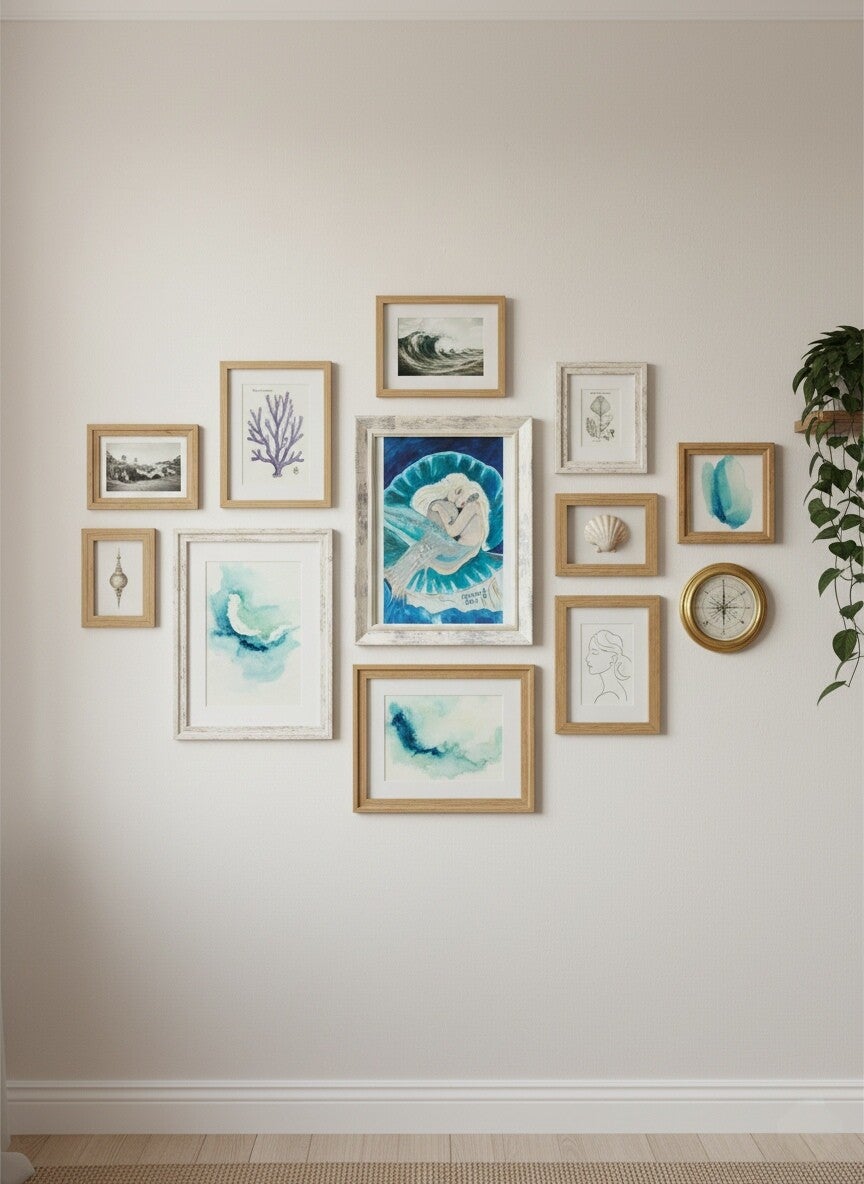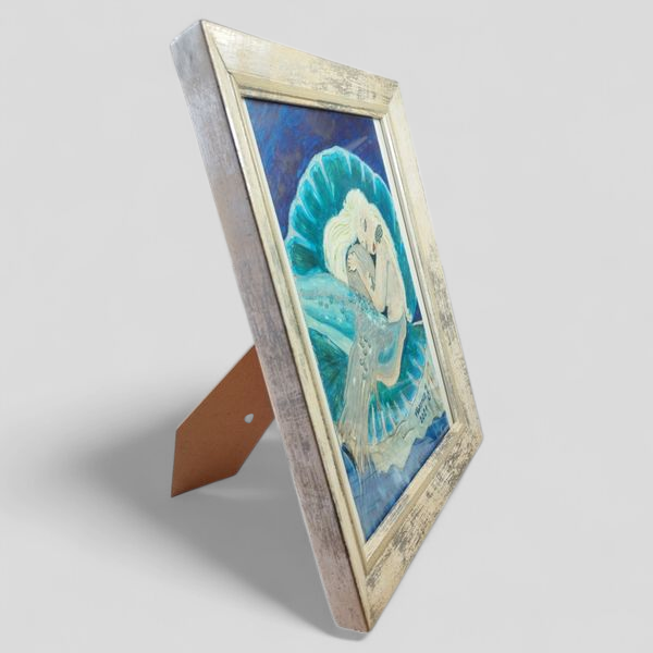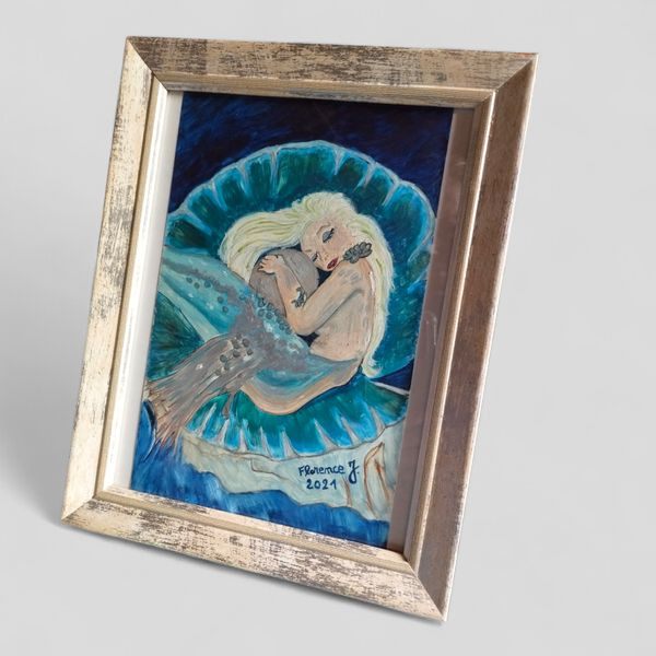 La sirène endormie est lovée dans un grand coquillage, serrant contre elle une perle symbolique. Les couleurs dominantes, un mélange apaisant de bleu océan et de turquoise, confèrent à ce tableau une ambiance calme et onirique, parfaite pour apporter une touche de magie à votre décoration.