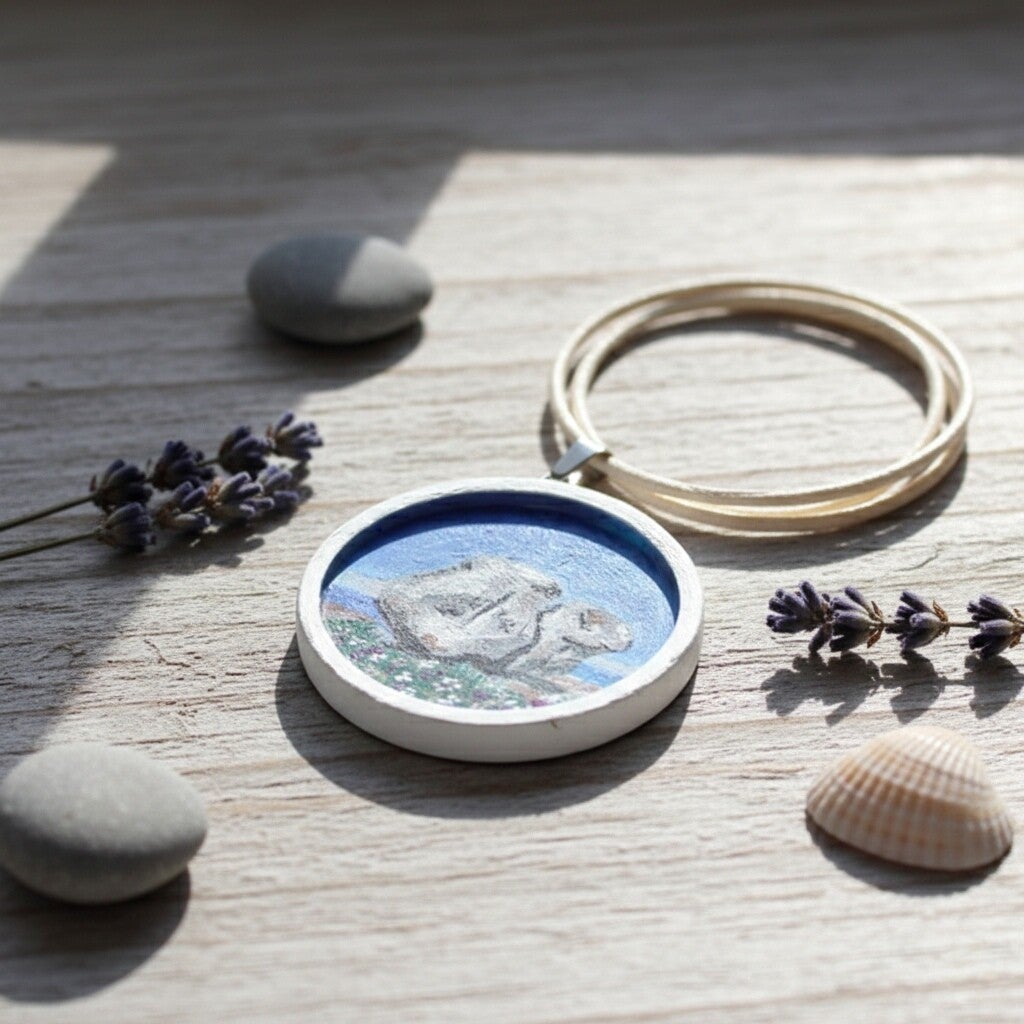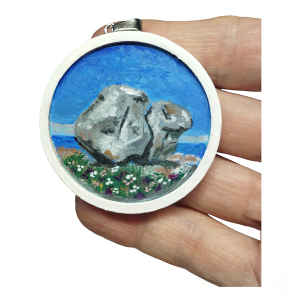 "Ce médaillon, peint avec délicatesse sur la noblesse du bois, est un hommage au singulier Rocher Escargot, emblème de la magnifique Côte de granit rose. Capturant sa forme patiente et sa couleur chaleureuse, sculptée par les vagues et le vent, il évoque la sagesse de la nature qui prend son temps pour façonner la beauté. C'est un bijou qui porte en lui un fragment de ce littoral légendaire, un symbole d'enracinement et de persévérance."