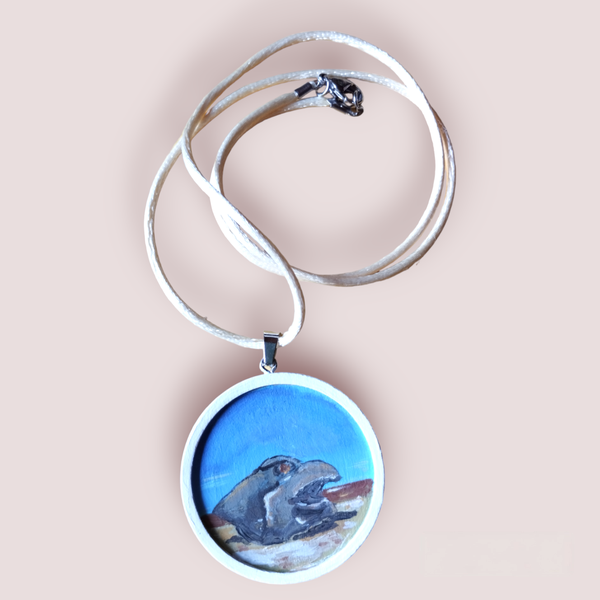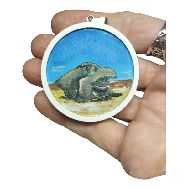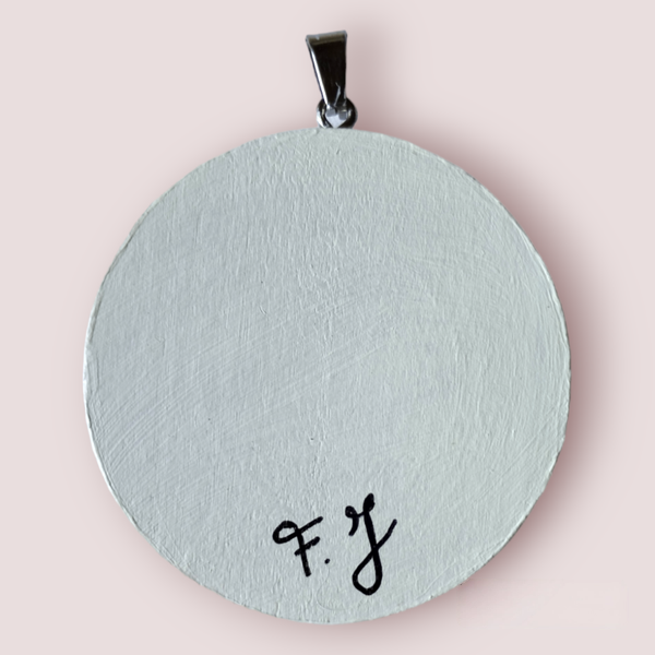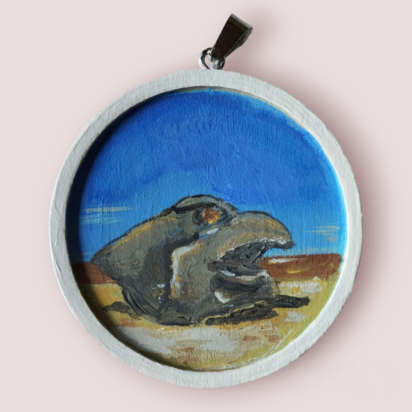 "Ce médaillon, peint avec délicatesse sur la noblesse du bois, est un hommage au mystérieux Rocher de la Sorcière à Trégastel. Capturant sa forme intrigante et sa silhouette légendaire, il évoque la beauté sauvage et la magie de la Côte de Granit Rose. C'est un bijou qui porte en lui l'âme minérale de ce littoral unique, un symbole de caractère et de force tranquille."