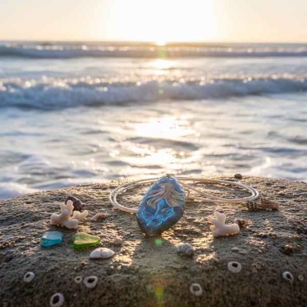 "Ce pendentif en Pierre, Merlyne est un véritable fragment de la magie des profondeurs, une sentinelle bienveillante inspirée par la puissance protectrice de l'océan. Chaque pierre, avec ses nuances uniques, est un écho des vagues et des mystères marins, offrant une touche de sérénité et une connexion profonde avec les énergies bienfaitrices de la mer."
