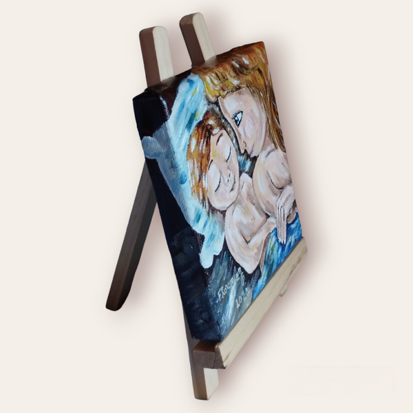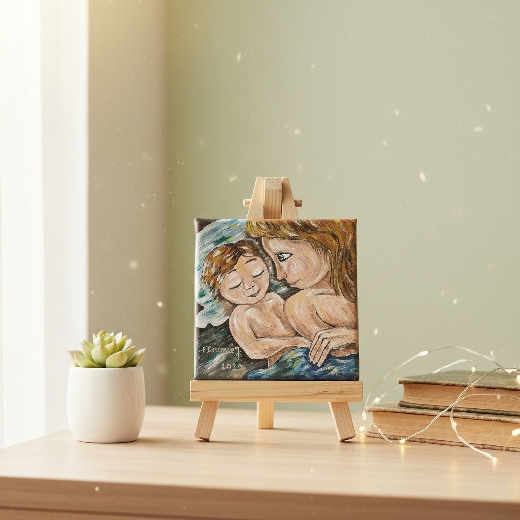 Peinte à la main à l’huile, cette œuvre miniature exprime la douceur de la maternité dans un style poétique et apaisant.