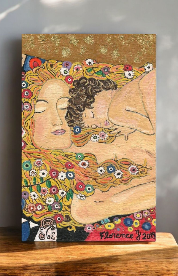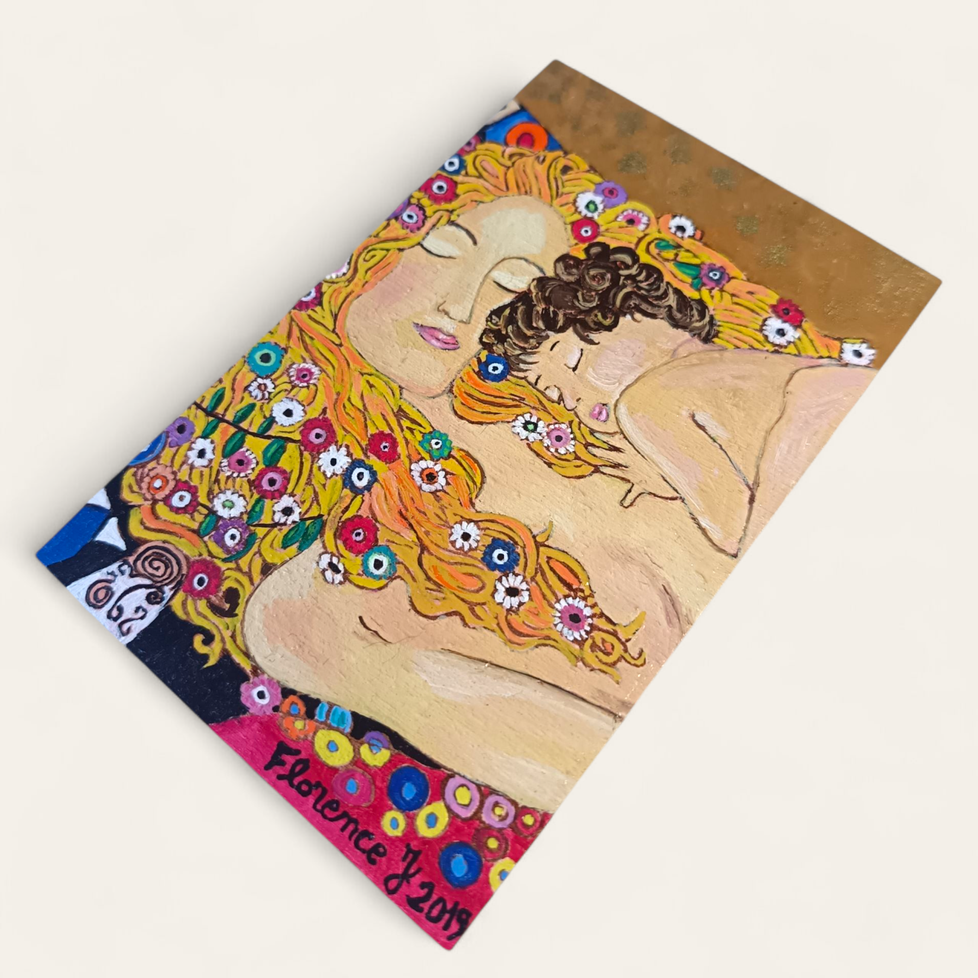 Inspirée par les motifs décoratifs et symboliques de Klimt, cette création unique mêle poésie, chaleur et délicatesse, sur bois, pour une présence douce et précieuse.