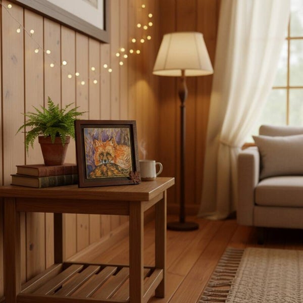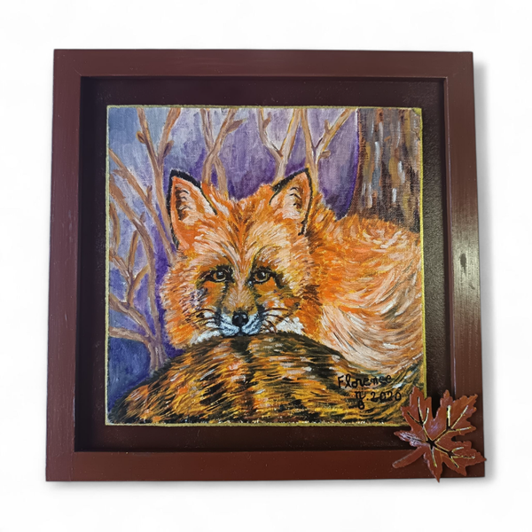 Ce tableau n’est pas seulement une peinture, c’est une pièce unique entièrement mise en valeur par mes soins : son cadre a été peint à la main dans un brun chaud, travaillé pour rappeler les teintes de l’automne. J’y ai ajouté un fond dégradé violet-brun lumineux, souligné d’un filet doré raffiné qui met en relief la douceur du renard.