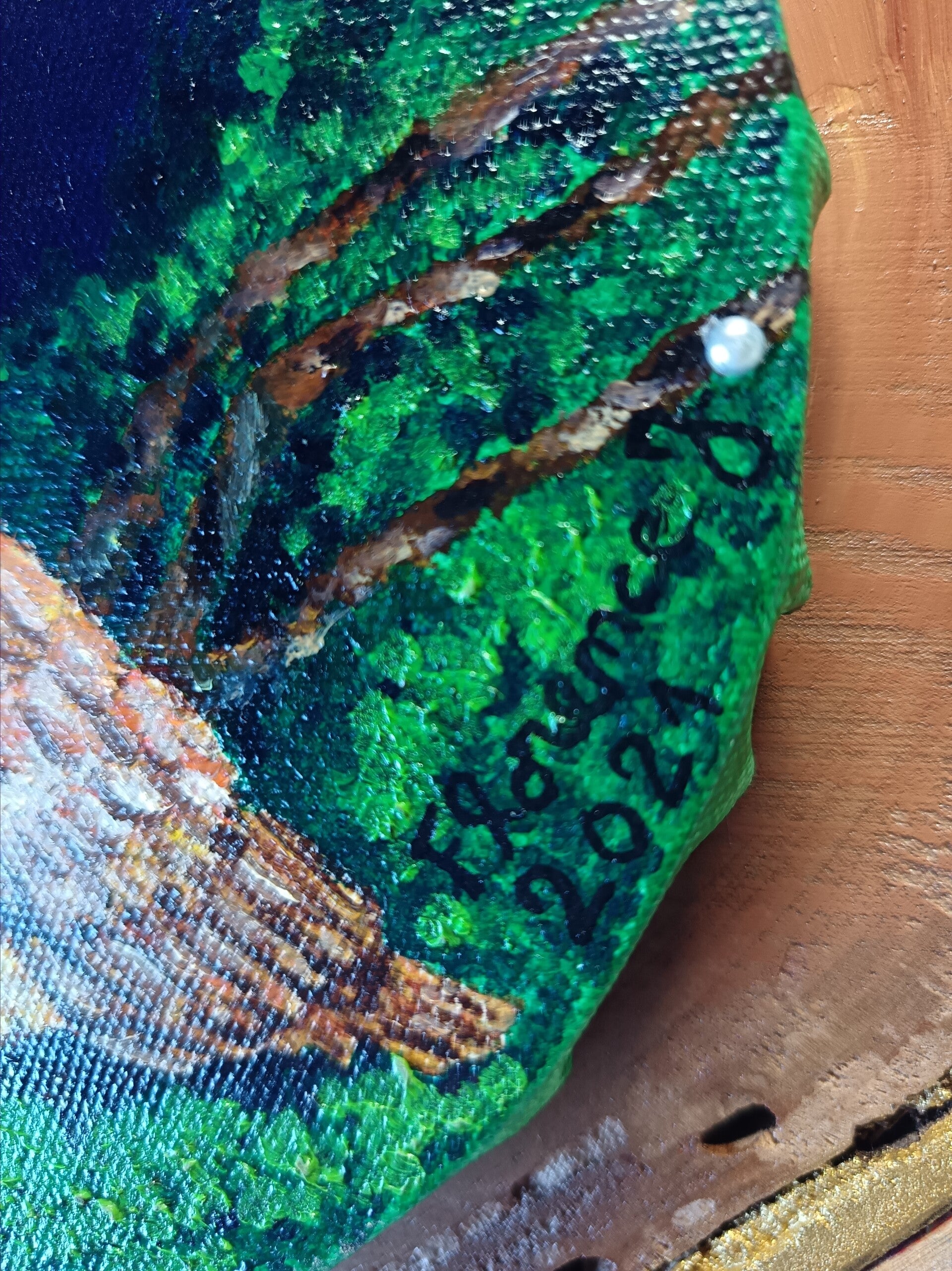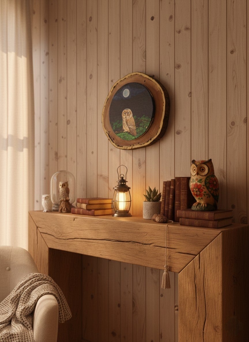 Cette œuvre poétique et détaillée associe la chaleur du bois naturel au charme d’une peinture à l’huile lumineuse, où chaque coup de pinceau révèle la douceur du plumage et la profondeur du ciel nocturne.