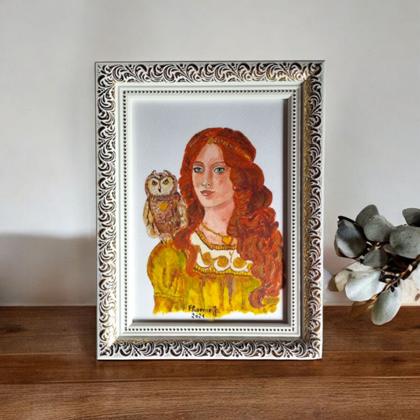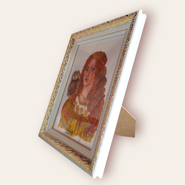 Avec ses cheveux de feu et son regard pénétrant, Athéna est ici accompagnée de sa fidèle chouette, symbole de connaissance et de perspicacité. L'alliance du jaune doré, couleur de la divinité, avec l'élégance du cadre baroque, transforme cette œuvre en un véritable talisman de sagesse pour la maison.