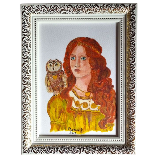 "Déesse Athéna et sa chouette" est un hommage à la puissante déesse grecque de la sagesse, des arts et de la stratégie.