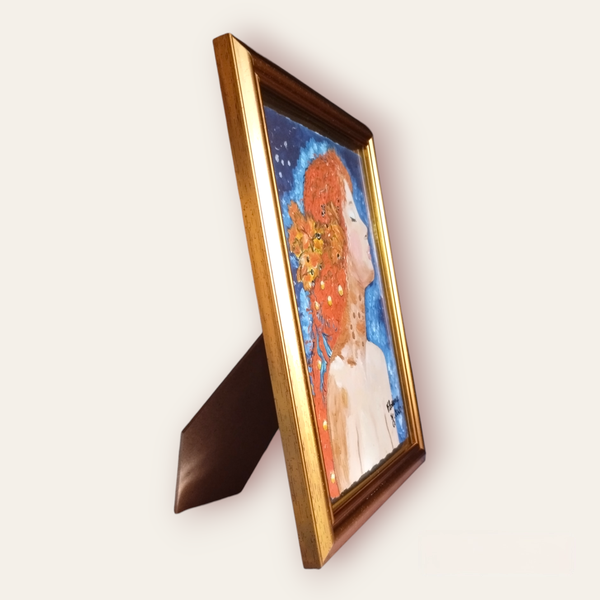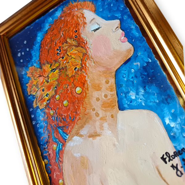 La jeune femme, auréolée de feuilles dorées et de lumière, semble se fondre dans un univers onirique où la nature et les songes ne font plus qu’un.