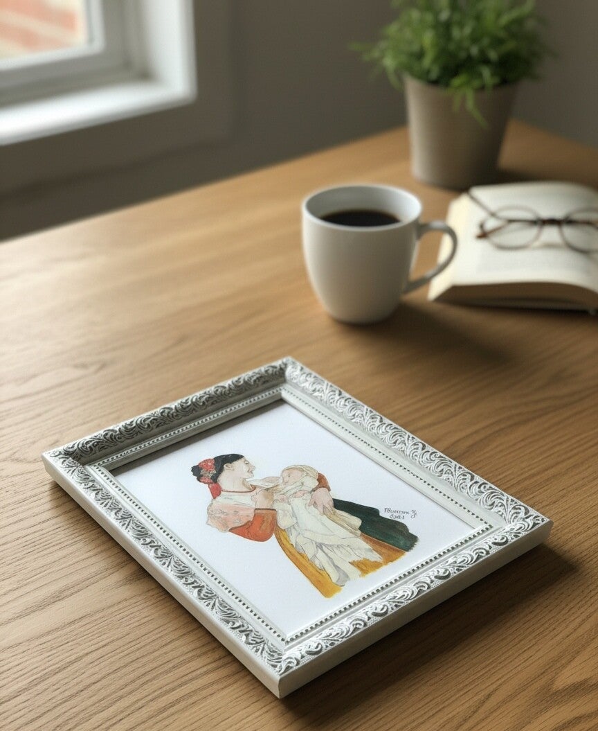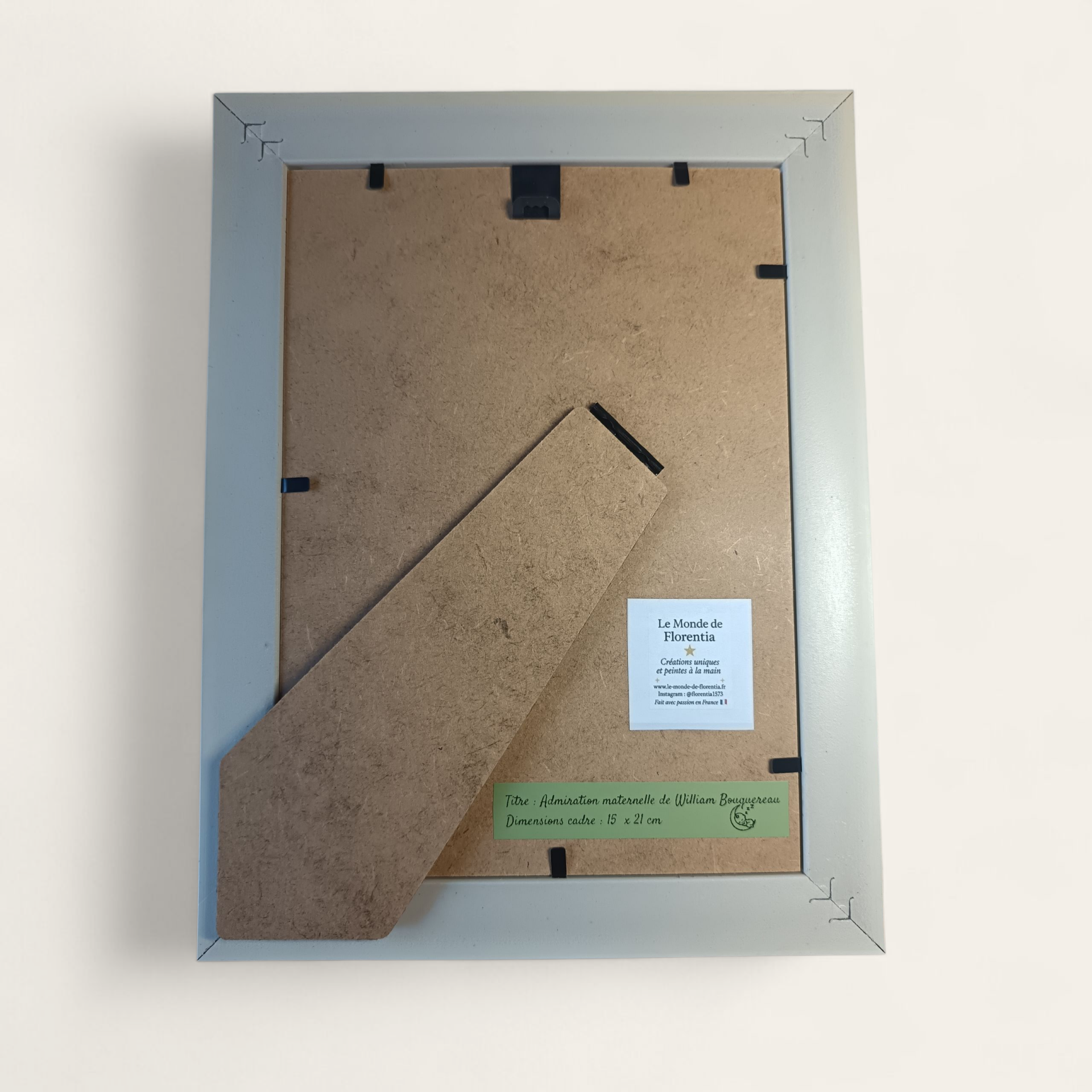 Parfaite pour un coin lecture, une chambre d'enfant, ou pour embellir une galerie murale, cette peinture est une invitation à la tendresse et à la contemplation.