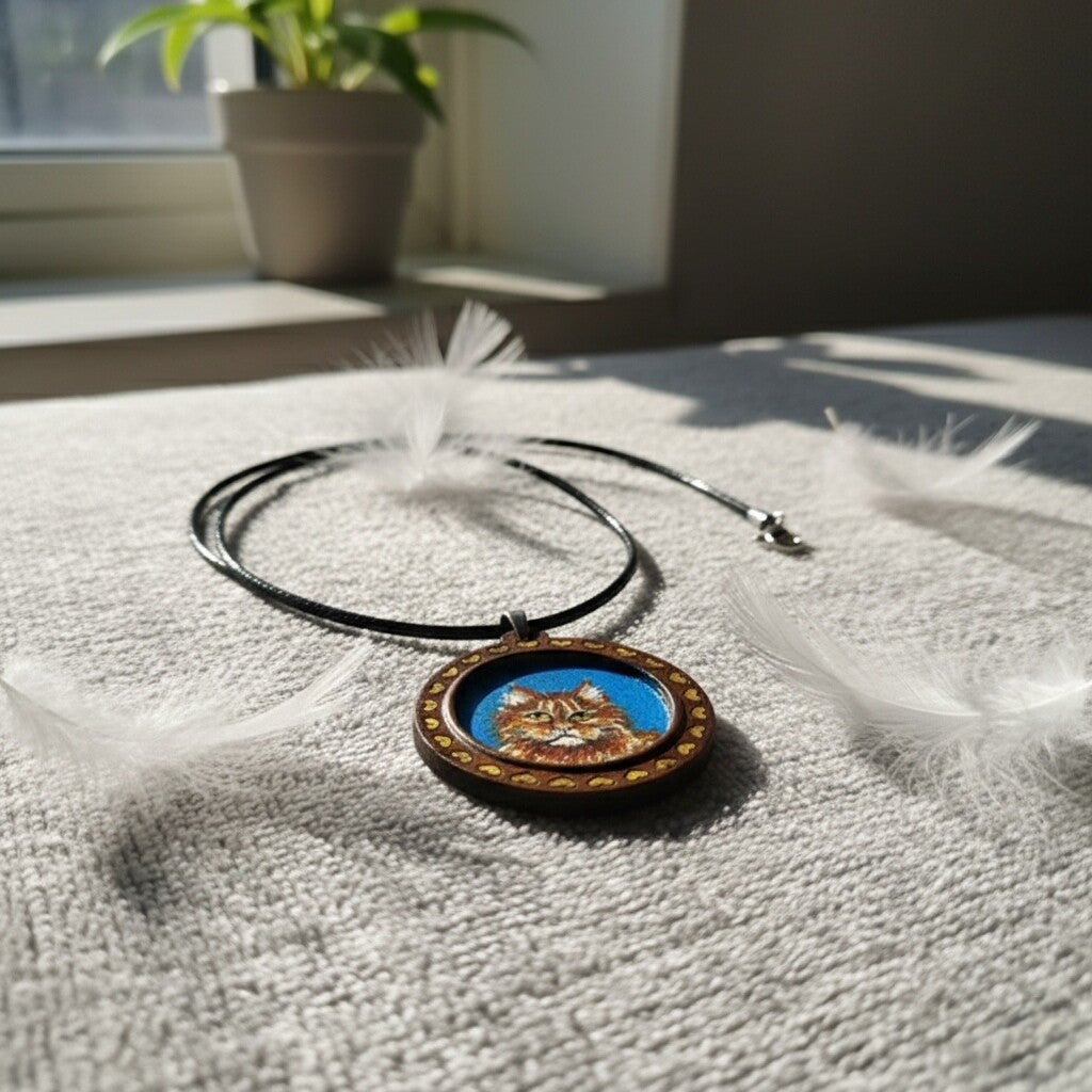 "Ce médaillon, peint avec délicatesse sur la noblesse du bois, donne vie à l'image douce et ensoleillée d'un chat au pelage couleur caramel. Chaque coup de pinceau est une invitation à la tendresse et à la rêverie, capturant l'essence même de la douceur féline. C'est un bijou qui porte en lui la chaleur d'un moment de quiétude et la magie d'un compagnon imaginaire, pour un sourire au quotidien."