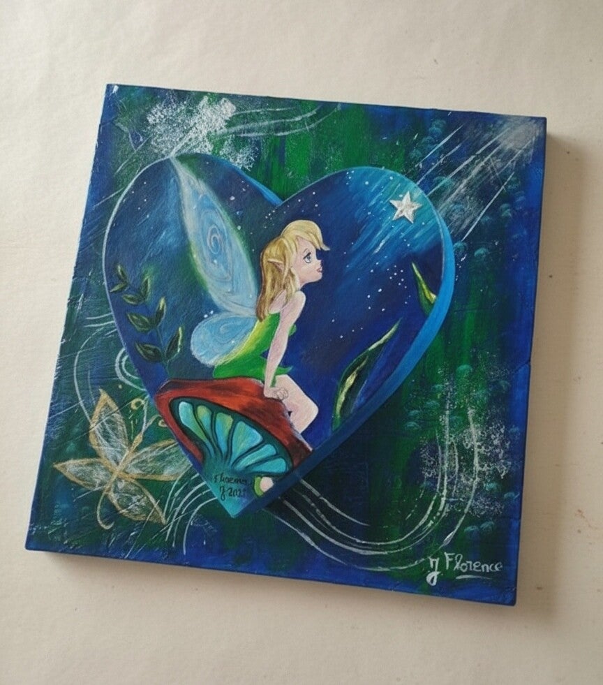 Au centre, la fée s'anime dans une toile cartonnée en forme de cœur, offrant un effet 3D saisissant et poétique. Peinte à l'huile pour une profondeur et une richesse des couleurs incomparables, elle est assise sur un élément champignon rouge, observant une étoile brillante qui guide son chemin.
