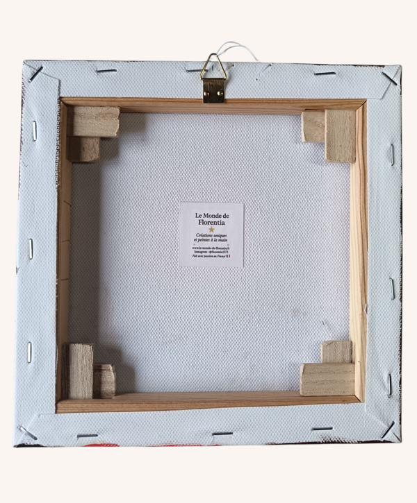 Réalisée à la main à la peinture à l’huile sur une toile en coton de 20 x 20 cm, cette œuvre est protégée par un vernis brillant-gloss qui met en valeur l’éclat des couleurs et la finesse des détails.