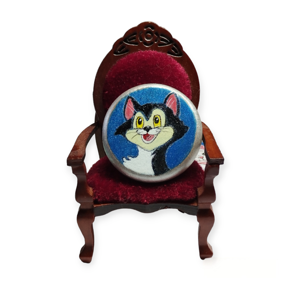 "Cette broche, peinte avec délicatesse sur la noblesse du bois, donne vie à l'adorable et facétieux chat Figaro, le fidèle compagnon de Pinocchio. Chaque coup de pinceau est une invitation à la tendresse et à la nostalgie du conte, capturant l'essence même de ce félin expressif. C'est un bijou qui porte en lui la magie d'une amitié intemporelle et la douceur d'un personnage emblématique, pour un sourire teinté de fantaisie au quotidien."