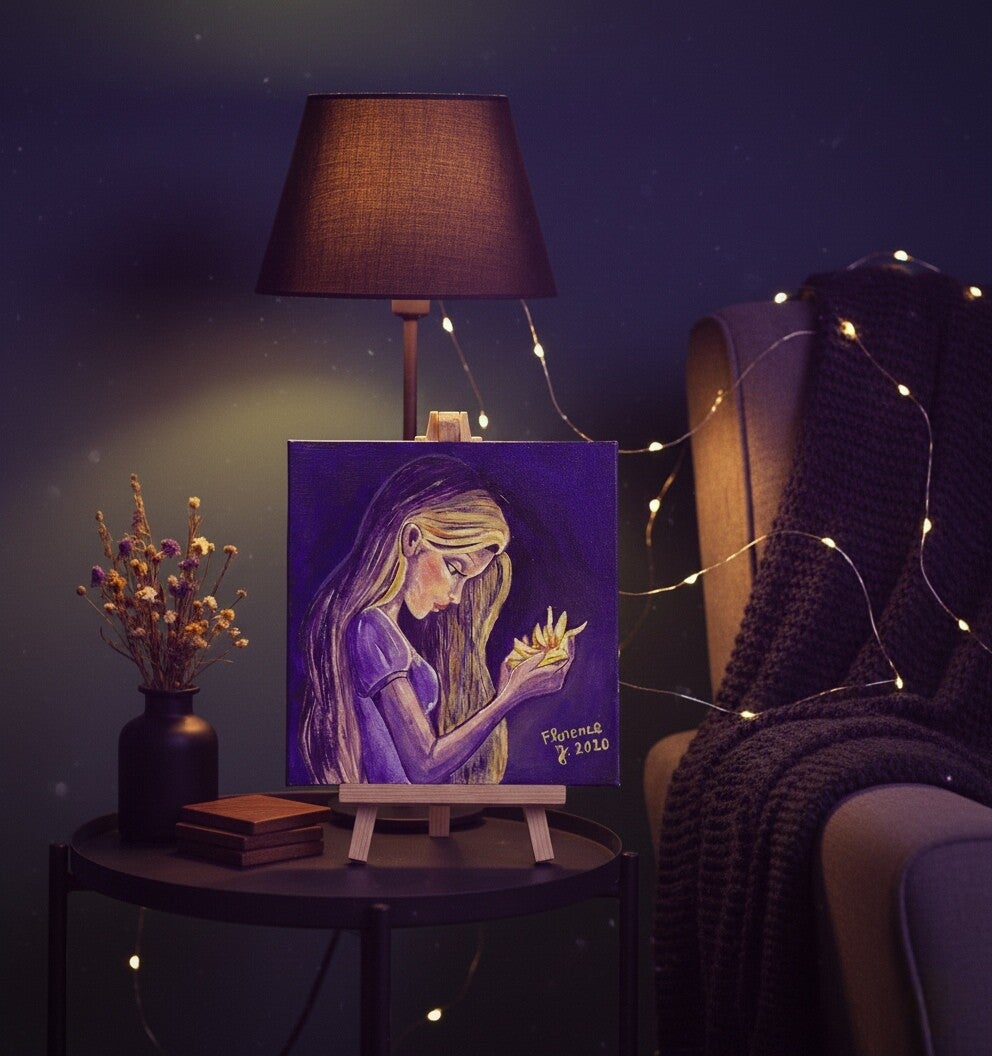 Cette lueur dorée semble porter ses pensées, comme si la fleur représentait la naissance d’une idée, d’un rêve ou d’un univers intérieur.