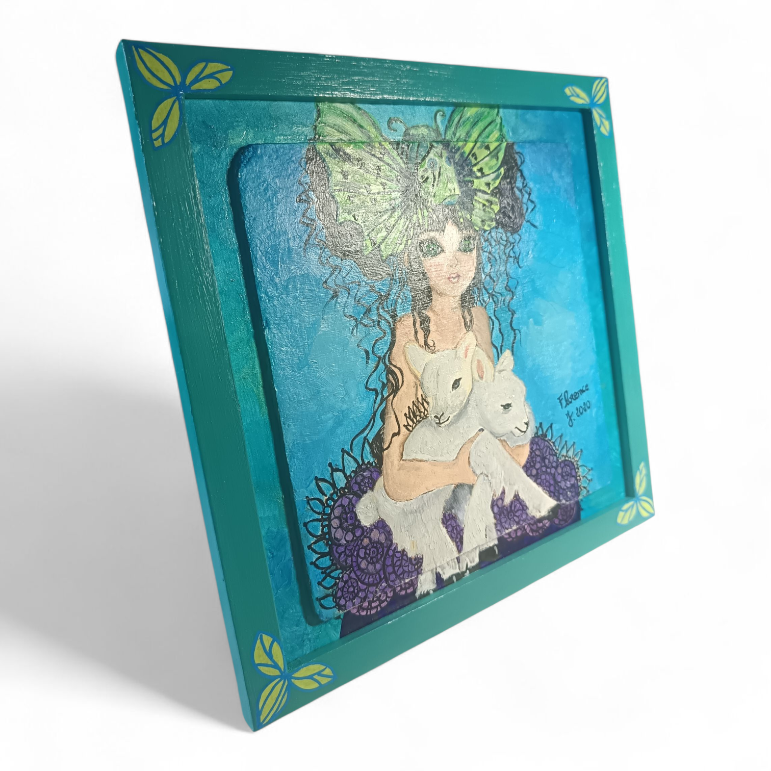Le cadre, peint et verni à la main dans des tons turquoise rehaussés de motifs de papillons, complète harmonieusement la scène et met en valeur la luminosité du tableau.