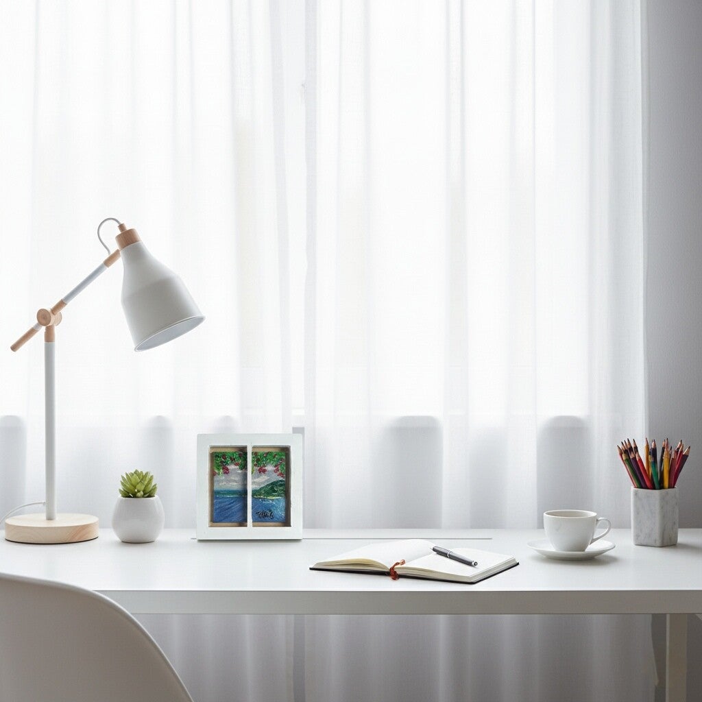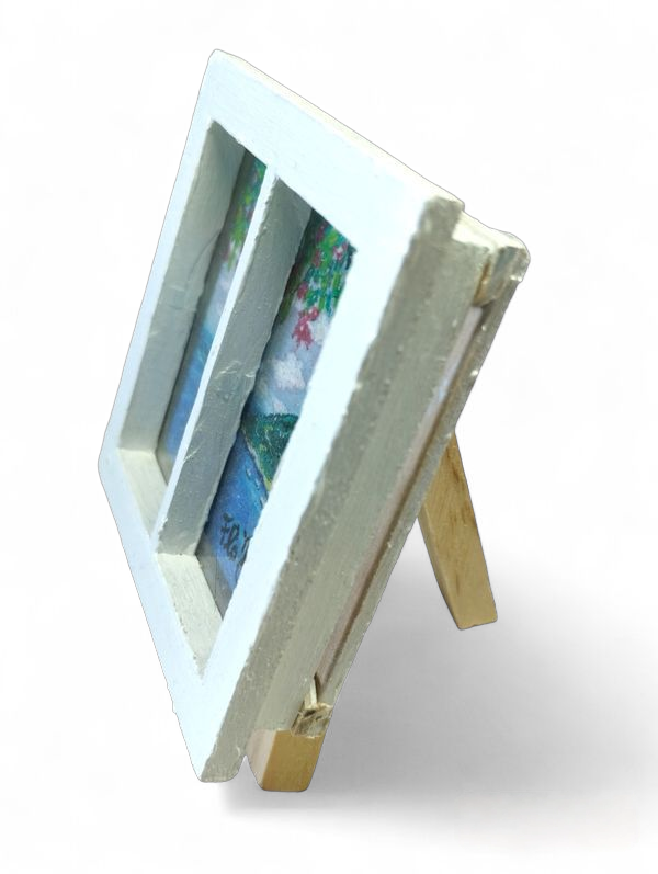 Cette œuvre miniature capture la douceur d’un instant suspendu, celui d’une évasion côtière où tout semble calme et infini. Le cadre en bois blanc, travaillé comme une véritable petite fenêtre, accentue la sensation d’évasion et de sérénité.