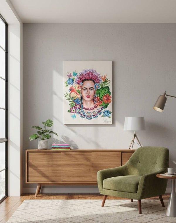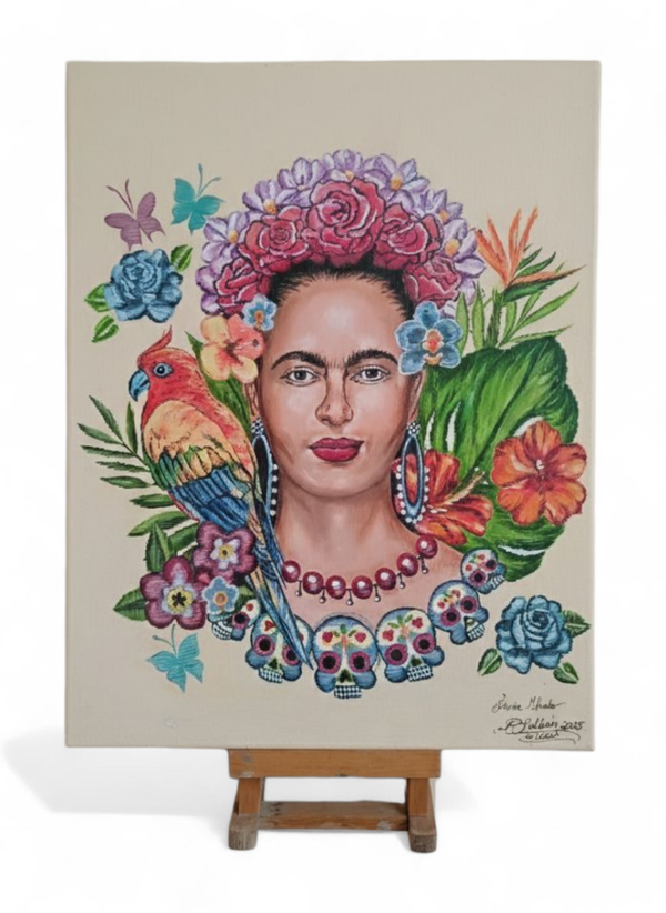 Cette œuvre originale, peinte à l'huile par ma maman, est un vibrant hommage à l'icône Frida Kahlo, capturant son esprit indomptable et son univers foisonnant. Le portrait est sublimé par une profusion de fleurs éclatantes, de motifs évoquant le folklore mexicain avec ses calaveras stylisées, et la présence majestueuse d'un perroquet coloré, symboles de vie, de nature et de culture. Le regard intense de Frida traverse la toile, porteur d'une force et d'une poésie singulières.