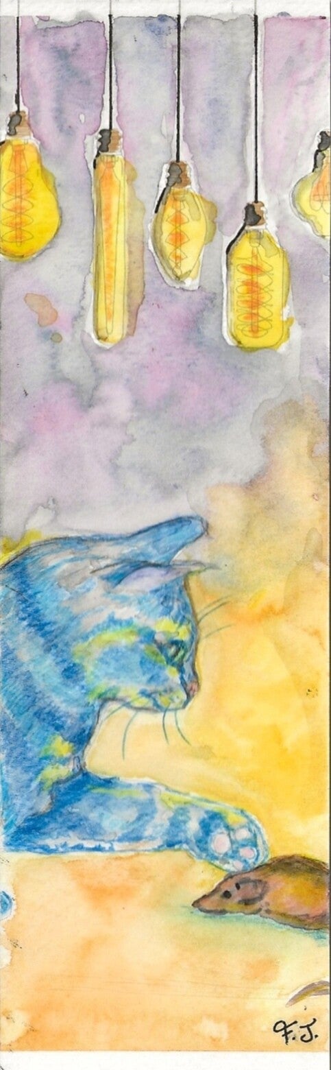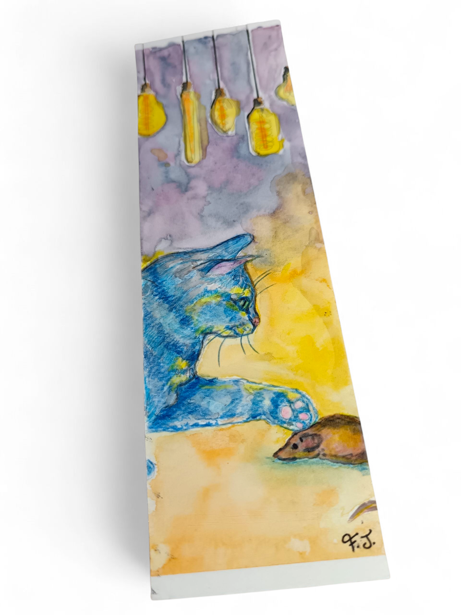 🐱💡🐭✨ Marque-page “Sous les Lumières – Chat & Petite Souris” – Aquarelle & crayons de couleur