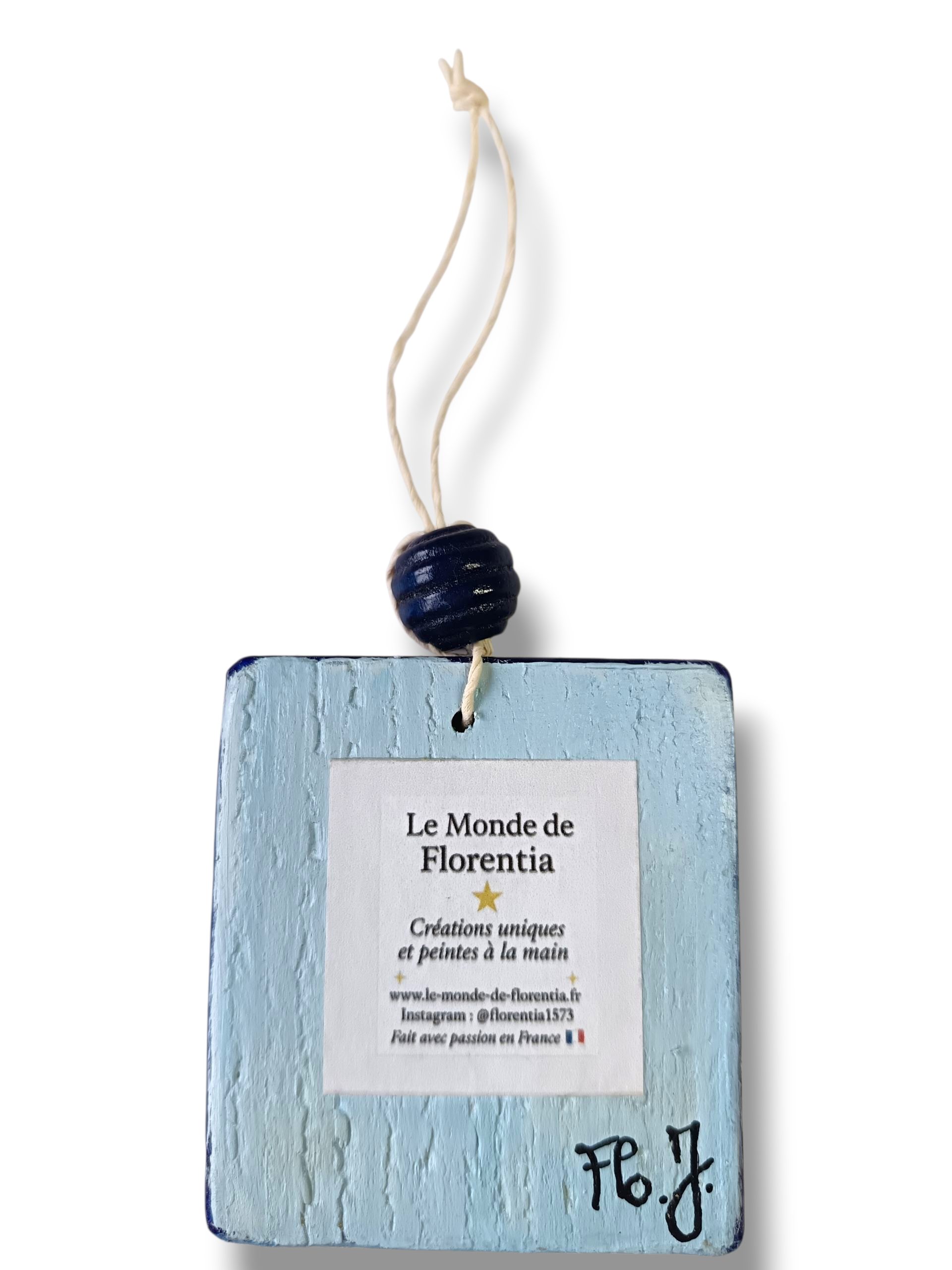 Matériaux : bois, peinture acrylique, corde naturelle, perle décorative