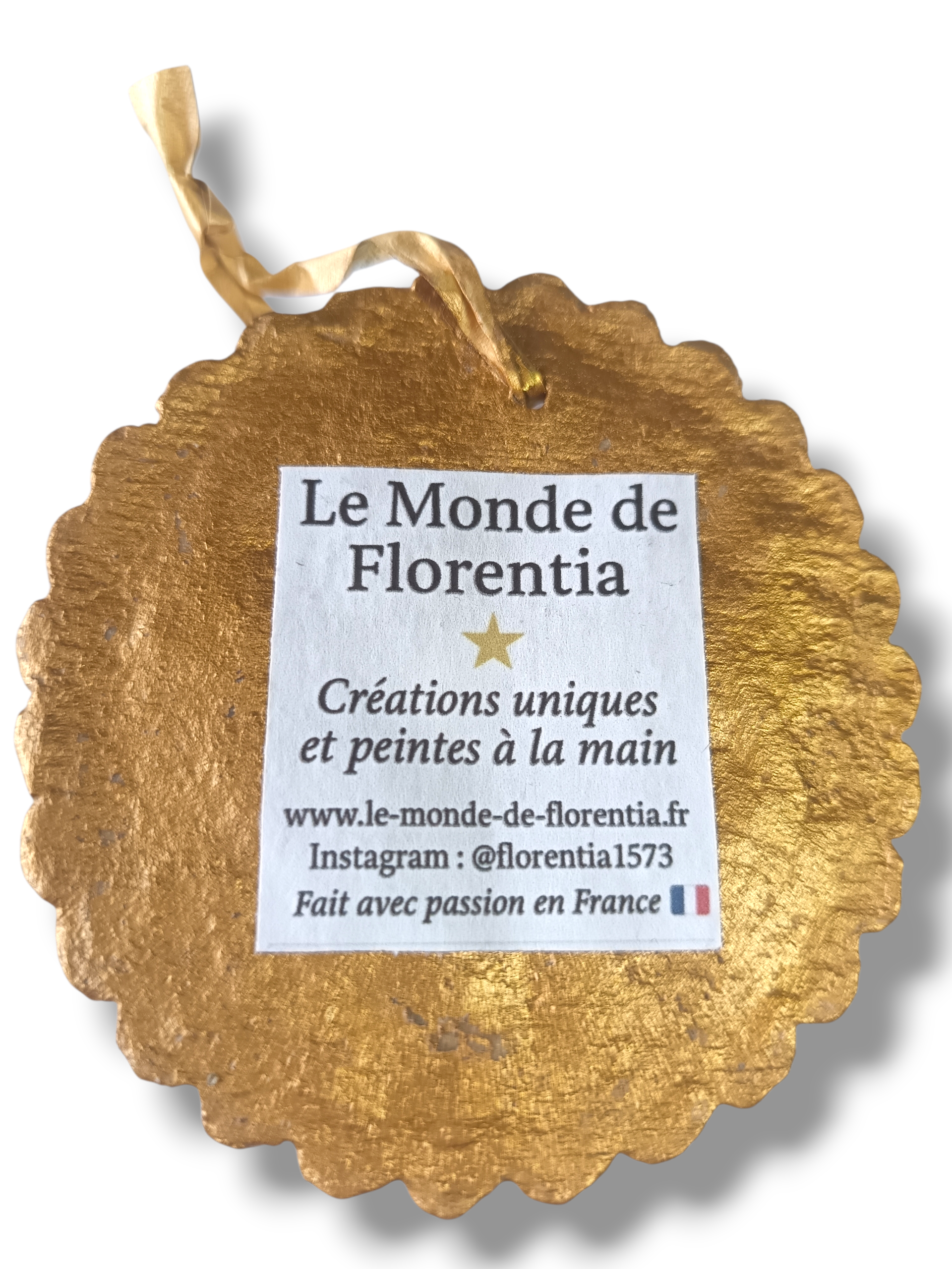 Un ruban doré permet de l’accrocher facilement au sapin ou dans votre intérieur.