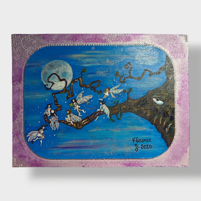 Chaque détail – du fond irisé aux finitions argentées – a été travaillé avec soin pour créer une atmosphère féerique et poétique, où les fées se rassemblent sous la clarté de la lune pour partager un instant de magie et de lumière.
